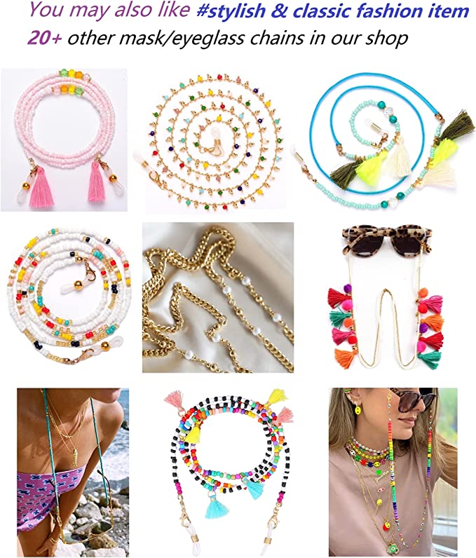 • 【قابل للتعديل】: تحتوي سلسلة النظارات على حلقات حاملة قابلة للتعديل مع ملف معدني، يمكن ارتداؤها وخلعها بسهولة لتثبيتها، مما يجعل نظارتك لا تسقط بسهولة. لا تقلق أبدًا بشأن فقدان نظارتك مرة أخرى. سهلة التركيب والفصل، لسهولة الاستخدام. حبل قصير للقناع، والسلسلة وقناع الوجه